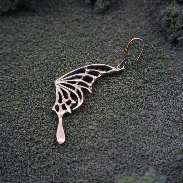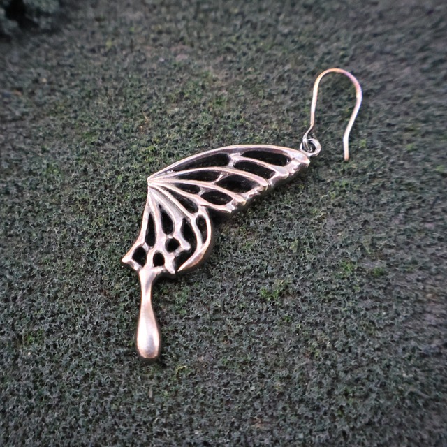 物語の舞台、アリエ帝国の森には美しい蝶が生息している。その名もCrescentail butterfly(クレセンテイルバタフライ)。 羽根の一部が、三日月型をしていることからその名がつけられた。蝶でありながら、夜間に活動することでも知られ、月光を浴びて、黒い鱗粉を輝かせながら飛ぶ姿は実に神秘的である。 (「空想……物語を身に着けて欲しい」という願いから、オリジナルのファンタジー小説「Witch Glinde」を執筆し、その舞台に生きる植物や動物、道具などをモチーフにしてジュエリーを創っています。 小説は下記URLより、無料でご覧になれますので、是非ご覧くださいませ! https://novel.daysneo.com/works/bb3cf87c3a43baa781d0f1006e7ce9e4.html) 縦の大きさ約28mm. 横の大きさ約13mm. 重さ約1.8グラム ※この作品は受注生産となります。(完成までの平均期間は2~3週間となります。) 完成後の発送となりますので、お届けまでにお時間をいただく場合がございます。ご了承ください。 ※オリジナルのジュエリーポーチをお付けします。 ※この商品はピアスですが、価格は1個分になります。 ※素材は、スターリングシルバーです。
