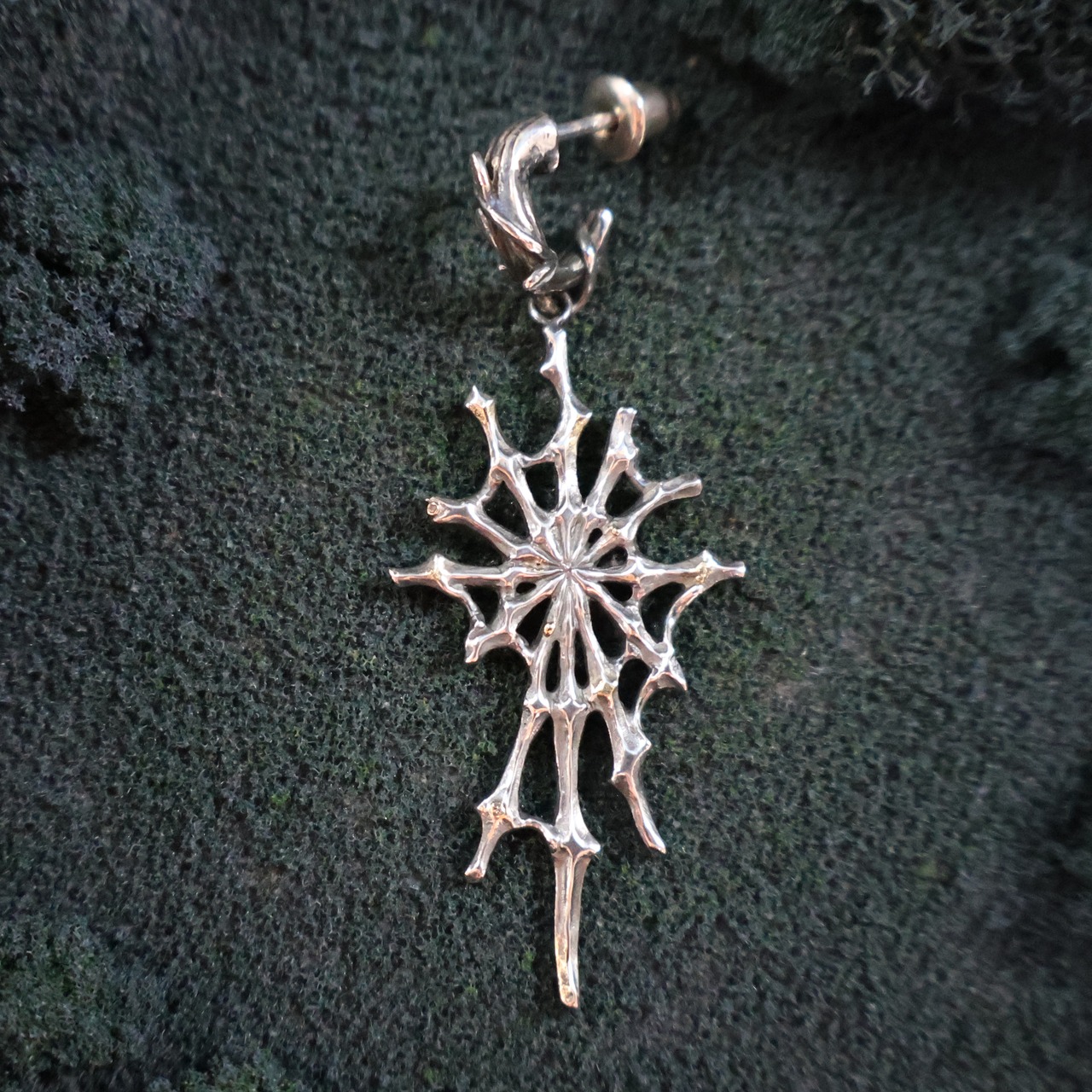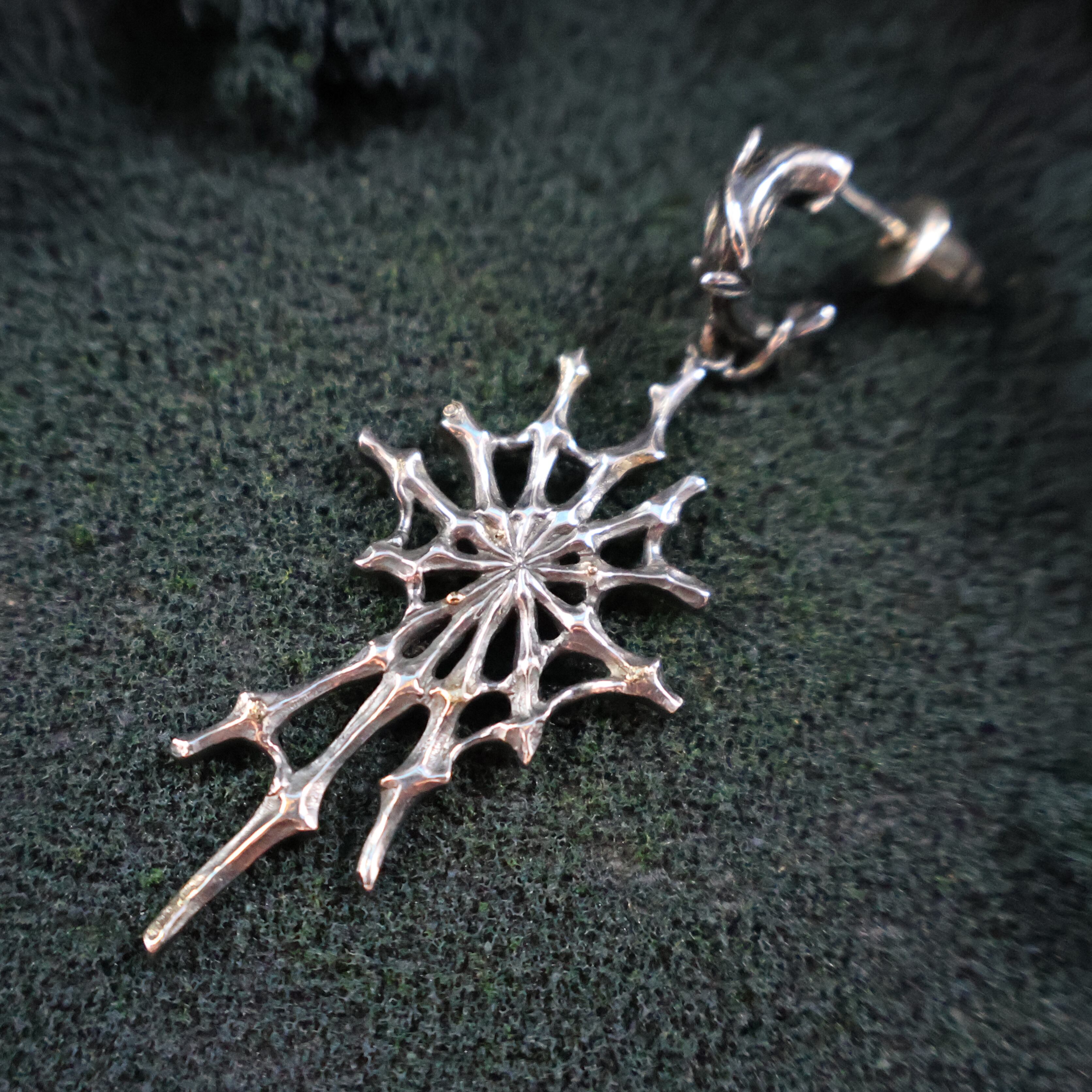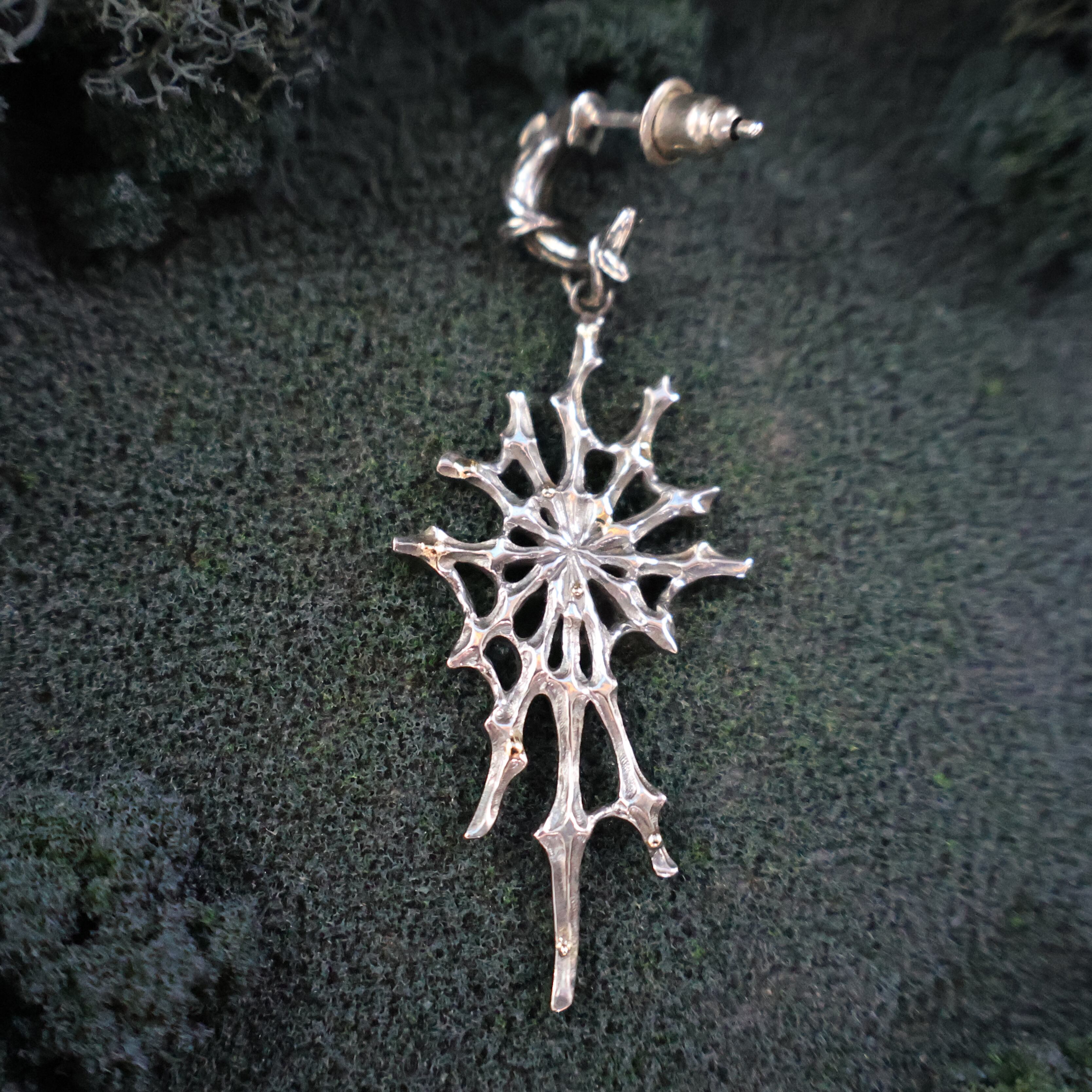 (日本語の小説では「ホシヨビグモ」と表記しています。ジュエリーでは、その光る物質を再現するために、金ロウ材を蜘蛛の巣部分に溶かして付けて表現しています)